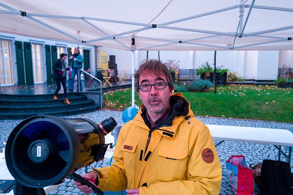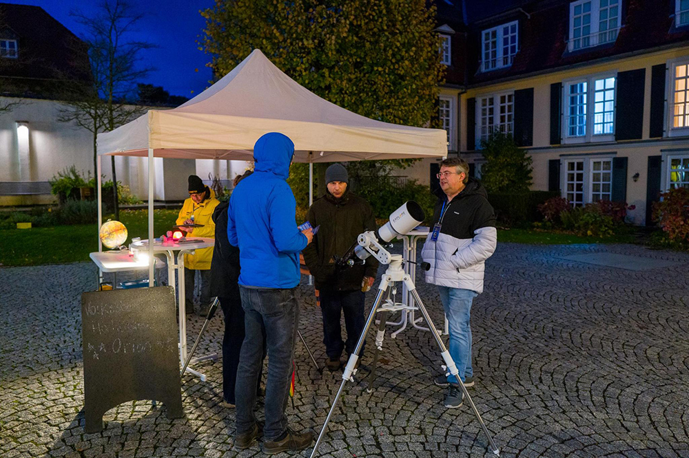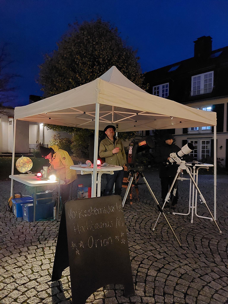 Viele Besucherinnen und Besucher hielten auf dem Weg zur Ausstellung an unserem Stand an, interessierten sich für die Teleskope, unsere Vereinsarbeit und die Volkssternwarte Hochtaunus. Besonders groß war das Interesse an unseren regelmäßigen Beobachtungsabenden und an der Frage, wie wir uns mit dem Thema Lichtverschmutzung befassen.