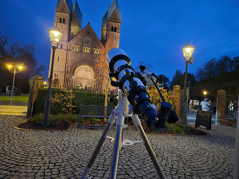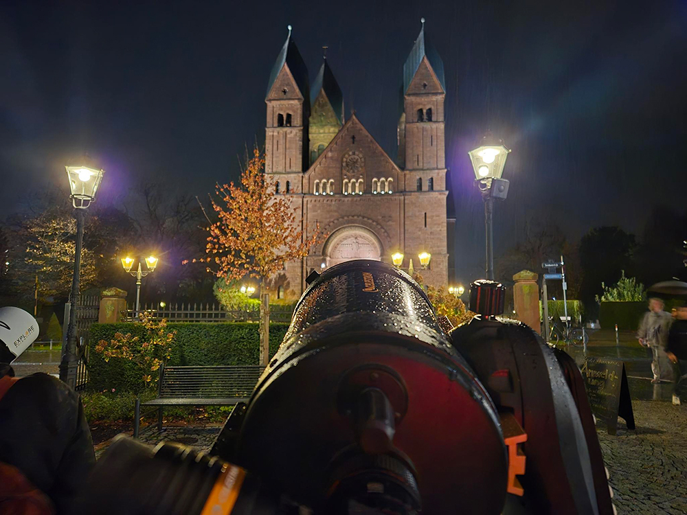 Der Abend begann mit einigen auflockernden Wolkenlücken und spannungsvoller Erwartung. Zwar blieb der Himmel später überwiegend bedeckt und es setzte zeitweise Regen ein, doch das tat der Begeisterung und dem großen Besucherinteresse keinen Abbruch. Unsere Teleskope standen bereit, gut geschützt unter dem vom Museum gestellten Pavillon. Als einziges dauerhaft sichtbares Beobachtungsobjekt diente die angestrahlte Erlöserkirche, die durch das Teleskop betrachtet viele neugierige Blicke auf sich zog. Zur Freude einiger Gäste ließ sich auch eine Eule blicken.